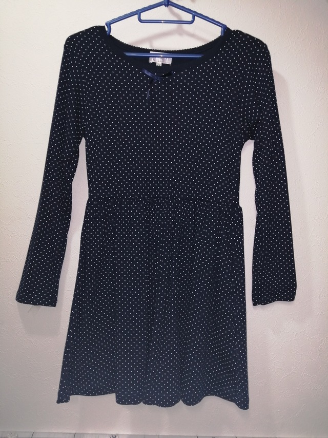 薄手で春、秋に活躍できる ドット柄のワンピース カラーは、ネイビーです。 サイズ 150㎝ 総丈 約70㎝